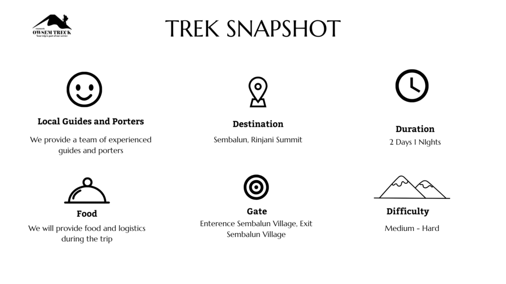 2Days 1Night Mount Rinjani Trek. The trek begins at Sembalun Village, passing through savannah landscapes before reaching Sembalun Crater Rim for an overnight stay. Early the next morning, the journey continues to Mount Rinjani’s summit (3,726 m). From the peak, you’ll be rewarded with breathtaking views: a stunning sunrise, the serene Segara Anak Lake, and the vast expanse of Lombok. The summit’s beauty is the highlight of this short yet memorable adventure. After enjoying the views, the trek descends back to Sembalun to conclude the journey.
